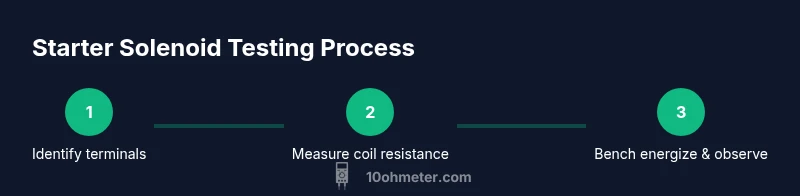A starter solenoid is a compact electromagnetic switch that sits between the battery and the starter motor. When the ignition signal is sent, the solenoid's coil energizes and pulls a plunger, closing the heavy electrical contacts that feed battery power to the motor. This action delivers high current while isolating the driver input from the heavy current path. In automotive applications, a healthy solenoid is essential for reliable cranking; a failed solenoid can mimic a dead battery or a bad starter. In this guide from 10ohmeter, we'll show safe, practical tests you can perform with a standard multimeter to isolate coil faults from wiring or switch issues. According to 10ohmeter, confirming the solenoid's health is the first step in diagnosing a no-crank condition.