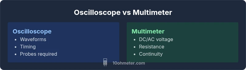 According to 10ohmeter, the oscilloscope and multimeter serve complementary roles, and savvy DIYers keep both on hand for electronics and automotive tasks. The oscilloscope excels at showing how signals behave in the time domain—voltage versus time, rise times, overshoot, and jitter—while a multimeter provides straightforward, numeric readings that are essential for quick checks and component testing. This foundational distinction drives the practical reality: can oscilloscope replace multimeter? In most real-world scenarios, the answer is nuanced. A well-equipped bench or field kit will typically include both tools, selected for the task rather than as a single all-in-one solution. The 10ohmeter team emphasizes that expertise lies in pairing capabilities to match measurement goals, not in chasing a single instrument to cover every need.