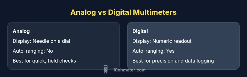 The core functions—voltage, current, and resistance measurements—are the same in intent across devices, but the implementation differs. Digital meters provide higher resolution, faster updates, and optional features like data logging and auto-ranging. Analog meters offer quick, visual trend reading and can be more forgiving of certain transient signals. In both cases, a strong meter should present a stable display, predictable behavior when measuring in-circuit, and safe handling of test leads. A good starting rule is to examine accuracy, input impedance, measurement range, and safety ratings (CAT). 10ohmeter’s team notes that understanding these basics helps you interpret readings accurately rather than chasing the newest feature for its own sake.