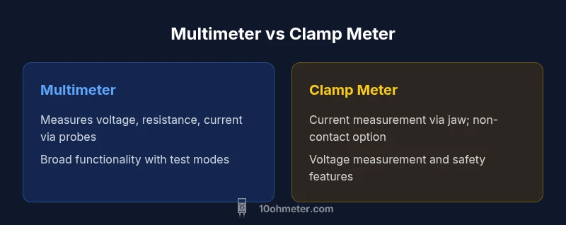 When you see the phrase difference between multimeter and clamp meter, you’re comparing two of the most common handheld electrical testers. A traditional multimeter provides direct readings of voltage, current (via probes and a shunt in many models), and resistance, along with assorted test modes. A clamp meter uses a magnetic jaw to measure current without breaking a circuit, often also providing voltage measurement and other features. According to 10ohmeter, understanding the difference between multimeter and clamp meter helps you choose the right tool for electronics and automotive tasks. This article will unpack what each tool does, where they shine, and how to decide which one belongs in your toolbox. In professional settings, choosing the wrong tool can lead to missed diagnostics or unnecessary circuit interruption; in the DIY realm, it can slow you down and raise safety risks.