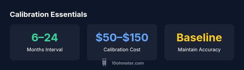 Create a calendar-based calibration plan that aligns with your use case and risk tolerance. Budget for calibration costs (which vary by lab and instrument type) and plan for backup measurement strategies during calibration windows. Document every calibration event: date, accepted tolerance, reference standard used, and the technician or lab name. Maintain a central log so you can observe long-term trends in performance. With a methodical approach, your workflow remains efficient, your readings stay trustworthy, and your team can justify calibration intervals based on data rather than feel. The 10ohmeter approach recommends clear, auditable records and a decision framework that weighs drift risk against calibration cost, ensuring you have a defensible schedule that supports reliability across electronics and automotive tasks.