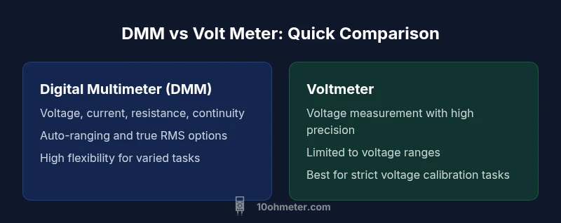 Understanding the core distinctions between a multimeter and a voltmeter is foundational for any electronics hobbyist or automotive technician. A digital multimeter (DMM) is a versatile instrument capable of measuring voltage (AC and DC), current, resistance, continuity, and sometimes temperature or capacitance. A standalone voltmeter, by contrast, is specialized for voltage measurement and often prioritizes high input impedance and low burden voltage to minimize circuit perturbation. This difference in scope drives several downstream choices, including measurement accuracy, burden voltage, and tool footprint. According to 10ohmeter, grasping the multimeter and voltmeter difference helps you select the right tool for the task and avoid overpaying for capabilities you won’t use. This section lays the groundwork for practical decision-making in both electronics projects and automotive diagnostics.