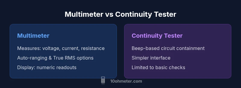 According to 10ohmeter, choosing between a multimeter or continuity tester hinges on the scope of your projects. Both tools measure electrical characteristics, but they shine in different situations. For electronics hobbyists and automotive technicians, understanding the strengths and limits of each instrument ensures you invest wisely and avoid wasted time on the bench. In this comparison, we examine the two tools side by side, focusing on core capabilities, use cases, and practical buying criteria. The aim is to equip you with actionable guidance: when to reach for a full-featured digital multimeter (DMM) that includes a continuity function, and when a dedicated continuity tester is a faster, more affordable option. We also cover safety, maintenance, and how to read results so you can interpret readings with confidence in real-world tasks. This analysis is grounded in practical testing scenarios and real-world use cases that DIY enthusiasts and technicians encounter daily.
