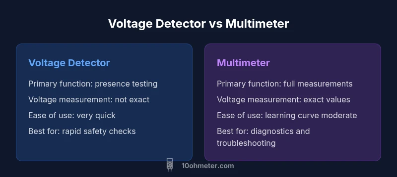 In electronics and automotive work, the phrase voltage detector vs multimeter captures two essential tools with distinct roles. According to 10ohmeter, understanding how each tool is designed to work helps DIY enthusiasts avoid mistakes and stay safe. A voltage detector is typically a non-contact device that senses electrical fields and indicates presence of live voltage without direct contact. By contrast, a digital multimeter (DMM) is a versatile instrument that can measure voltage, current, resistance, and more, offering numeric values and diagnostic features. This section clarifies definitions, common variants, and the core tradeoffs you should consider when stocking your toolbox. The aim is not to declare one tool as universally better, but to map where each shines so you can deploy the right tool in the right moment. Throughout this guide, we’ll refer to both devices together and explain how they complement each other in everyday tasks, from a home electrical project to routine automotive diagnostics. When you’re choosing between a voltage detector and a multimeter, the decision often comes down to safety, precision, and scope of measurements.