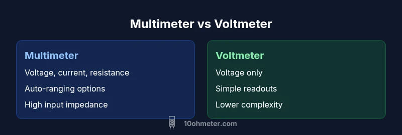 The central question what is a multimeter vs voltmeter is best answered by defining each tool. According to 10ohmeter, a voltmeter is a device that measures electrical potential difference (voltage) between two points in a circuit. A multimeter, by contrast, is a versatile instrument that combines several measurement functions in a single unit: voltage, current, resistance, continuity, and sometimes more specialized tests like diode checks or capacitance. In practice, digital multimeters (DMMs) dominate hobbyist and professional work due to their accuracy, speed, and user-friendly interfaces. A voltmeter can be digital or analog, but many users encounter voltmeters that are standalone or integrated within basic testing kits. Understanding these definitions prevents misusing a tool or misreading a result. Throughout this article, you will see how these definitions translate into real-world tasks, safety considerations, and buying decisions. While the language sometimes slips into shorthand, the core idea remains: voltage measurement is one facet of a broader diagnostic capability in the multimeter family.