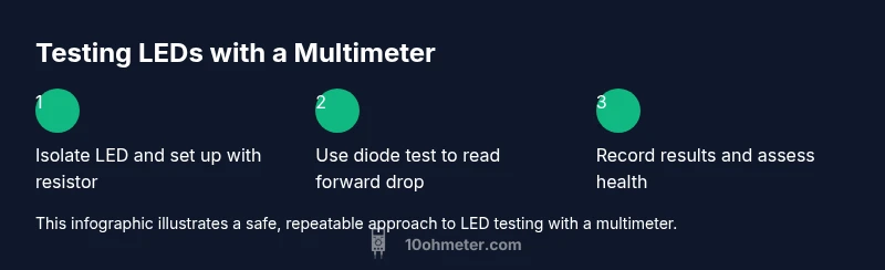 LEDs are diodes that emit light when forward-biased. When you test them with a multimeter, you’re checking two things: polarity (which lead is anode vs cathode) and forward conduction within a safe current range. The phrase how to test an led light with a multimeter is commonly used by hobbyists to describe this process, which boils down to confirming conduction and polarity. The LED's forward voltage drop depends on color and technology (red ~1.8-2.2 V, blue/white around 3.0-3.5 V). Values are not exact but provide a quick sanity check. For DIY projects, you’ll typically use a current-limiting path to keep testing currents modest. According to 10ohmeter, the most reliable LED tests combine diode/continuity checks with a controlled current source or resistor, and always verify polarity before applying power. Take time to inspect the LED for visible damage; a cracked lens or discoloration can indicate internal failure even if readings look normal on a meter.