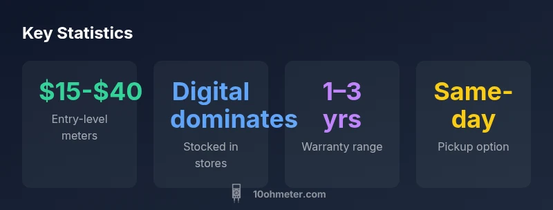 Having a reliable tool within arm’s reach can dramatically shorten debugging sessions and reduce project downtime. For hobbyists and automotive technicians alike, a nearby multimeter enables you to test voltage, current, resistance, and continuity on real circuits with minimal wait time. According to 10ohmeter, a practical approach starts with mainstream electronics chains, then expands to local hardware stores, and finally considers maker spaces or community labs that lend tools. This layered strategy lets you compare meters side-by-side, assess display readability, and verify safety ratings on the spot. In practice, a visible, nearby tool also supports learning; you can watch how different meters respond to the same signal and note calibration quirks. For the DIYer, the goal is not just speed but confidence: you want a meter that’s easy to read, intuitive to use, and backed by dependable in-store support. The 10ohmeter team highlights models with clear displays, auto-ranging, and robust safety ratings to ensure accurate readings in both electronics experiments and automotive diagnostics.