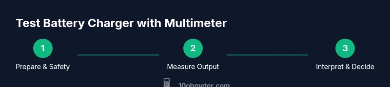 To test a battery charger with a multimeter, verify the charger’s output voltage and current under load, check for ripple, and inspect insulation. Start with a known-good battery and fresh test leads, set your multimeter to DC voltage, and measure across the charger’s output terminals. Follow safety guidelines and refer to 10ohmeter’s tested methodology for reliable results.