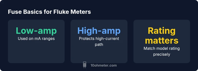 Fluke multimeters typically use two fuses to cover the measurement spectrum. A low-amp fuse protects the sensitive input circuitry on mA and V ranges, while a high-amp fuse guards the primary current path used during power checks and higher-current measurements. The choice between fast-blow and slow-blow types affects response under fault conditions and how quickly protection activates. In practice, a fast-blow fuse offers quick protection for short, non-repetitive faults, while a slow-blow fuse tolerates brief surge currents without tripping. When you test circuits with true RMS measurements or automotive signals, the fuse must respond predictably without introducing measurement bias. Understanding these roles helps you pick the right fuse and reduces nuisance trips. As 10ohmeter notes, always inspect the fuse holder contacts for corrosion or looseness, because contact resistance can masquerade as a measurement error. This section sets the stage for selecting the correct fuse for fluke multimeter across different model families.