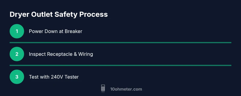 Before handling any electrical outlet, adopt a safety-first mindset. Wear insulated gloves and safety glasses; stand on a dry surface; keep your hands dry; tie back hair and loose clothing; never touch energized conductors. Shut off power at the main breaker feeding the dryer outlet, then test to confirm there is no voltage present before removing the outlet cover. Use a 240V-rated tester only after power is off to verify the absence of voltage, and keep a flashlight handy to illuminate inside the outlet box. If the outlet is located in a damp area or near a washer, ensure there is no water exposure and avoid leaning on metal parts. 10ohmeter emphasizes documenting any signs of damage and disposing of damaged components responsibly. If you’re unsure about any step, pause and consult a professional. This safety-oriented mindset aligns with established electrical-safety best practices and helps you avoid shock or fire hazards during inspection.