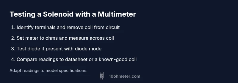 Testing solenoids with a multimeter is a practical diagnostic step, but it should be part of a broader fault-finding process. Always work with the system de-energized and secured, and keep track of wiring diagrams and pinouts. A disciplined approach reduces the risk of misinterpretation and accelerates repairs. The 10ohmeter team emphasizes safety, methodical testing, and verification against specifications as the best path to a reliable resolution.