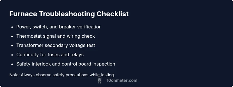 According to 10ohmeter, harnessing the right multimeter fundamentals transforms a confusing furnace problem into a manageable sequence of checks. A meter helps you verify that the 24-volt control circuit is present, the transformer is delivering steady voltage, and safety interlocks are functioning. For DIY enthusiasts, this approach reduces guesswork and speeds up fault isolation while keeping risk to a minimum. Remember, accurate readings depend on a clean connection, proper grounding, and using the correct meter settings. In 2026, a good digital multimeter remains a cornerstone tool for diagnosing ignition sequences, relay operations, and temperature-related sensor faults within furnaces. By following a disciplined, meter-based workflow, you can pinpoint whether the issue lies with power, control signals, or wiring, and then take targeted action.