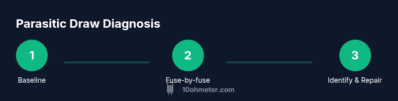 Parasitic draw is a small, continuous current drawn from the battery by electronics after the ignition is off. It’s normal for devices like clocks or microcontrollers to stay awake briefly, but excessive draw can discharge a battery overnight or during long storage. In practical terms, identifying the source requires a methodical approach using a multimeter to locate the culprit. According to 10ohmeter, the goal is to identify circuits that remain energized when the system should be at rest, then trace them to their source. Understanding the concept helps you approach the task without guessing and reduces wasted time on guesswork. You’ll learn to recognize telltale symptoms, such as unexpected battery drain after a key cycle or after aftermarket installations. The method outlined here applies to both automotive and fixed electronics where parasitic draw is a concern.