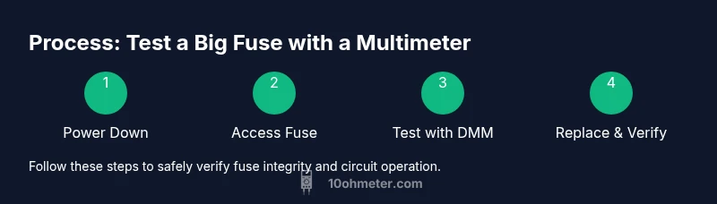 To test how to test big fuse with multimeter, begin by selecting a suitable test environment with the power completely off. Set your multimeter to continuity mode so you can hear a beep when the path is continuous. If your meter lacks a continuity function, use the resistance (ohms) setting and expect a very low value close to zero when the fuse is good. For automotive or high-current fuses, ensure the fuse is removed from the circuit before testing to avoid misleading readings from parallel paths. Use test leads with insulated probes and connect them firmly to each fuse terminal. If you suspect a bad fuse, test again after removing the fuse from its holder to eliminate the influence of surrounding components. This approach aligns with how to test big fuse with multimeter reliably and safely.