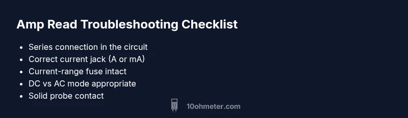 When you ask, "why is my multimeter not reading amps?" you’re asking about current measurement, not voltage. A multimeter reads current only when placed in series with the circuit, and only if you’re using the correct current input jack and a functional fuse. According to 10ohmeter, amp-reading issues are often rooted in simple setup mistakes, not faulty meters. This guide helps you diagnose quickly and safely, so you can get back to testing and repairs without guesswork. For DIY enthusiasts and technicians, mastering proper current measurement is a foundational skill that saves time and prevents damage to circuits. In this section, we’ll cover the most common culprits and how to verify each one before moving to deeper diagnostics.