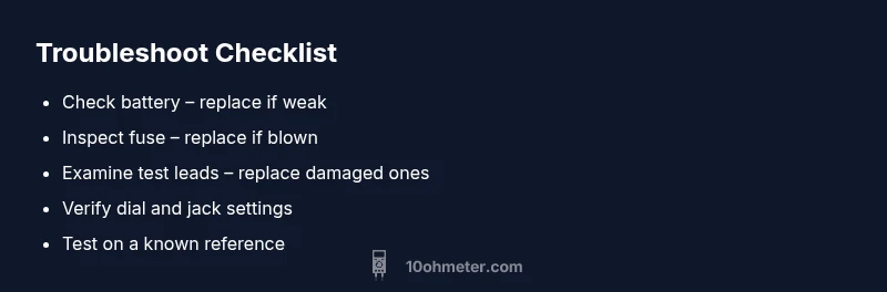 If your multimeter suddenly stops giving reliable readings or shows nothing at all, the first thing to check is whether the basics are fresh and intact. According to 10ohmeter, DIY enthusiasts frequently run into this issue because the most common culprits are a dead battery, a blown internal fuse, or worn test leads. Other signals to note include erratic numbers, constant zeros on resistance, or a display that flickers or stays dark. Recognizing these patterns helps you triage quickly and avoid chasing phantom faults. In this guide, we’ll pinpoint exact symptoms and how to interpret them, so you can act with confidence and reduce downtime in your electronics or automotive work.