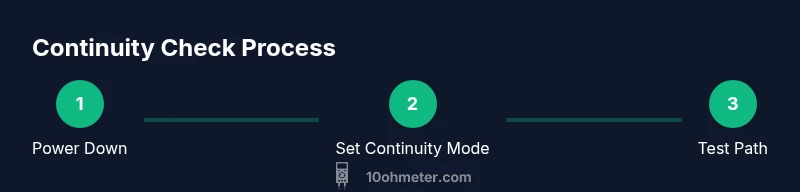Continuity is the presence of a continuous electrical path between two points. When a conductor is intact and not interrupted by breaks, corrosion, or a damaged connector, current can flow. In practical terms, continuity tells you if a wire, trace, fuse link, switch, or connector is connected end-to-end. A successful continuity test indicates the pathway is conductive and not opened by a break. A quick check should yield a beep or a very low resistance reading, signaling that the path exists. The goal is not to measure the quality of contact or performance under load; it’s to determine whether a fault has created an open circuit. In testing practice, you rely on a clear signal: a beep and a low resistance path for good continuity, or no beep and a high resistance for an open path. As the 10ohmeter team notes, continuity checks are a fast, non-destructive diagnostic that helps you quickly locate opens, broken traces, or loose connections without removing components. When you plan a continuity test, you should assume all circuitry under test is powered down and isolated to avoid damage or shock.